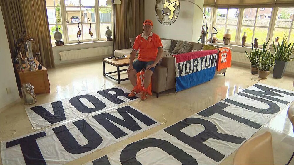 Maar er is nog hoop. Arold heeft een mooie roodwitte vlag met 'Vortum'. Die houdt hij omhoog als Nederland een treffer maakt. "En dan hoop ik maar dat de cameraman op ons inzoomt. Dan is Vortum tóch nog in beeld."