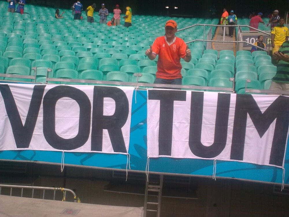 Arold Arts mist vanwege vervoersperikelen de eerste wedstrijden van Oranje. Maar dat wil niet zeggen dat het spandoek Vortum er niet is. Oud-pastoor Aloys Botden van Oploo leest in deze krant over het probleem van Arts en zorgt voor een oplossing. ,,Zijn nicht uit Zuid-Afrika was toen net in Nederland. Hij stond erop dat zij een spandoek van mij mee naar Afrika zou nemen en bij de wedstrijd Nederland tegen Japan in het stadion zou ophangen. Zij had kaartjes. Mijn spandoek hing in de derde ring.”