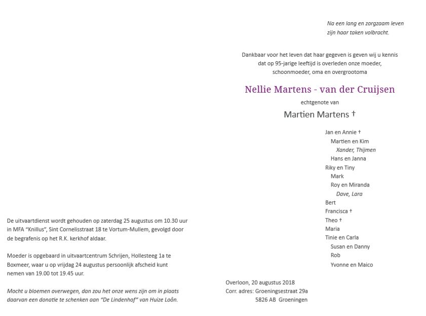 Overlijden Mevr.Martens