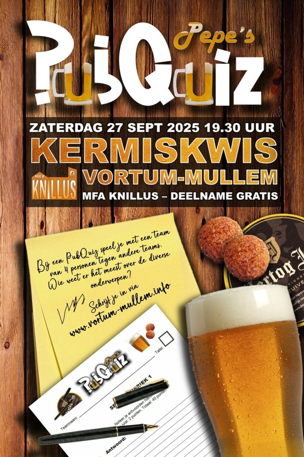 - Vorm een team van (bij voorkeur) 4 personen. Met dat team speel je de kermiskwis vanaf 19.30 uur tot ongeveer 23 uur.